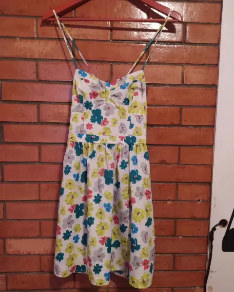 Lindísimo vestido floreado, con tirantes cruzados y elástico en la espalda, con forro, sin ningún detalle. Muchas gracias y muy bonito día a todas!! 😉