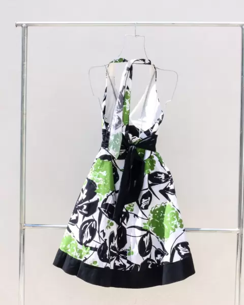 Vestido corto floreado negro con verde, con zipper en la parte trasera y se amarra por la parte de atrás del cuello. Talla 9.