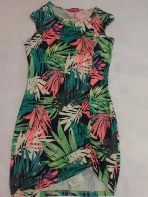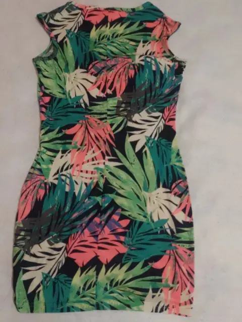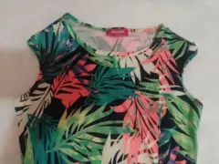 Vestido floreado corto. Vestido con hojas de palmeras, corto. Tiene una manga pequeña, es de cuello redondo. Tiene un lindo detalle de un lado de la pierna con resorte que lo hace lucir sexy. Es como para niña o una persona delgada