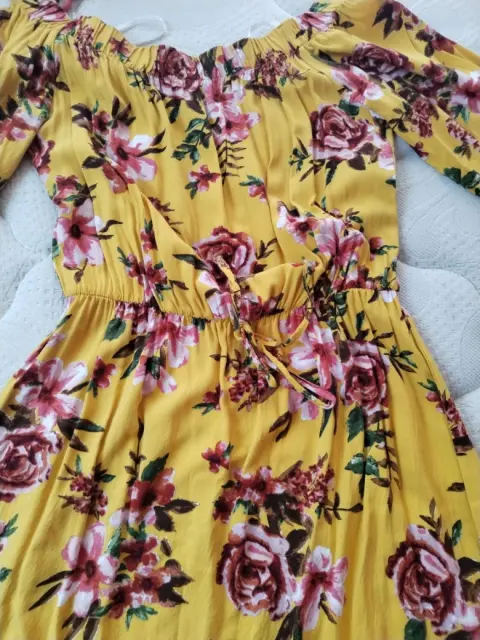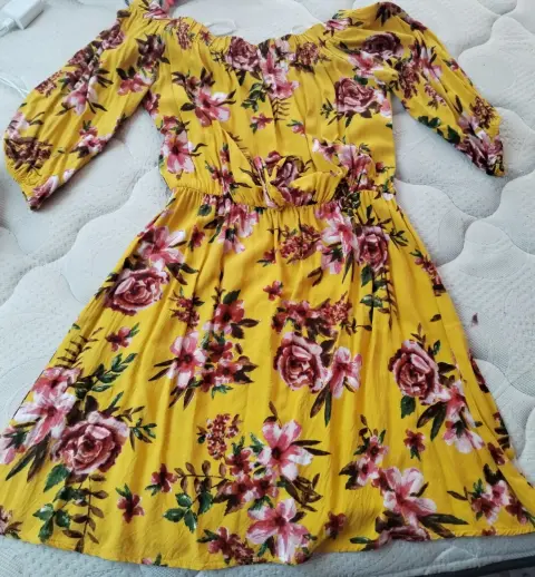 Vestido floreado en amarillo moztaza. Vestido floreado en color amarillo moztaza. En talla EG.. Es super lindo para cualquier tipo de evento de día. Ademas de que es suave, fresco y cómodo. Y en la compra del vestido te obsequio un collar de fantasía