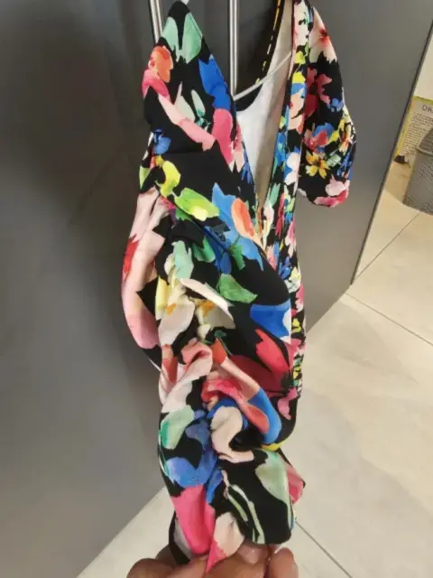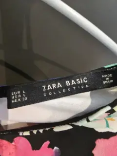 Vestido floreado Zara. Es un vestido con fondo color negro y estampado de flores de diferentes colores, la talla es L pero está reducido a S, como me encantó y no había mi talla, me lo ajustaron. La espalda es tipo V por lo que queda ligeramente descubierta.Las medidas son:Busto: 40 cmCintura: 36 cmLargo: 85 cm