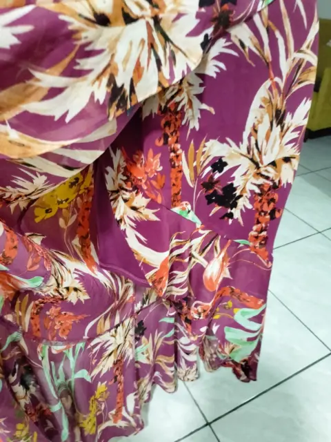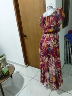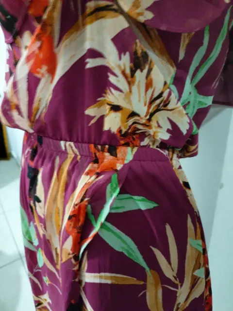 Perfecto estado, sin detalles, tela vaporosa, es talla S pero por los resortes del hombro y cintura puede dar a un M. Tiene faldilla en la parte de abajo.
