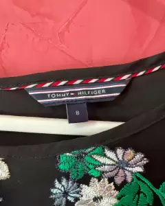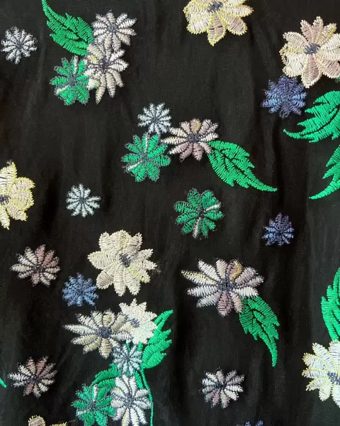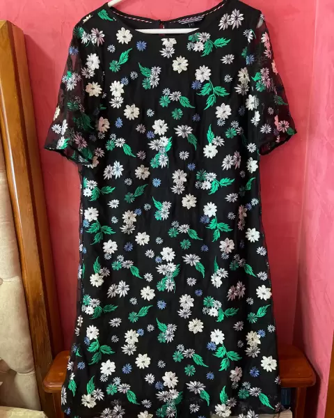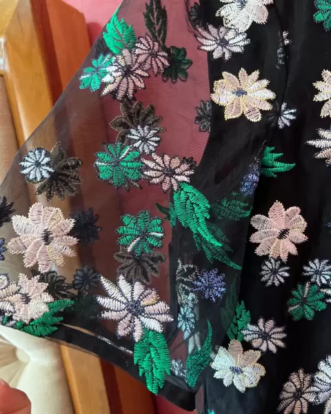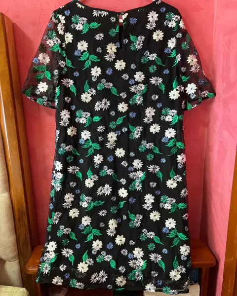 Vestido corto con flores bordadas en contraste, lleva forro y botón en la parte de atrás, mangas transparentes