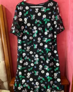Vestido flores bordadas. Vestido corto con flores bordadas en contraste, lleva forro y botón en la parte de atrás, mangas transparentes