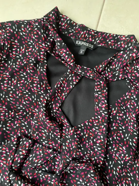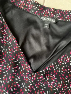 Hermoso vestido corto de manga larga , es negro con estampado en tonos guinda, tiene la cintura marcada con resorte y dos tiras en el cuello V para hacer un moño