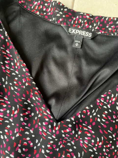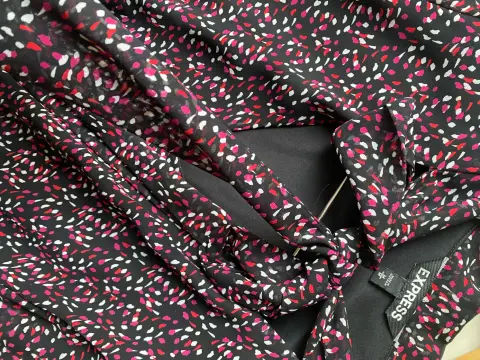 Vestido fluído de manga larga. Hermoso vestido corto de manga larga , es negro con estampado en tonos guinda, tiene la cintura marcada con resorte y dos tiras en el cuello V para hacer un moño