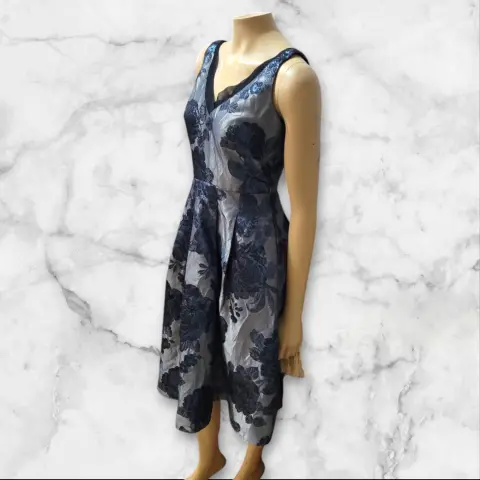 Vestido Formal Bllack arouse aback Market, talla, 4, colores azul y negro con printing de flores, tirantes de espagueti ancho, cuello en V, estilo A, cierre largo atras, forrado por dentro, hecho con nylon, y polirester mide 51cm de axila a axila, falda amplia, detalles de flores bordados, mide 44cm de hombro a hombro, 42cm de cintura con 100cm de largo del hombro hacia abajo nuevo a estrenar