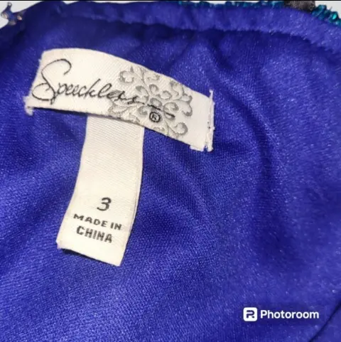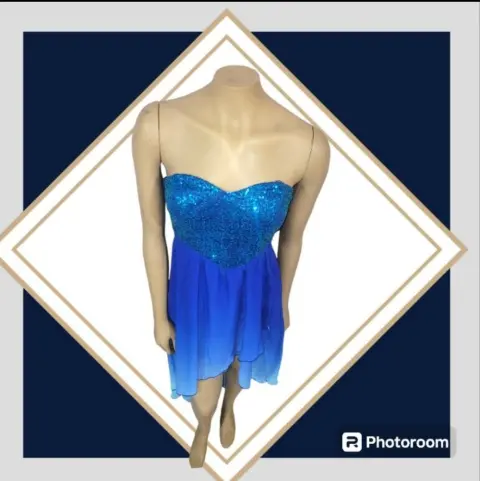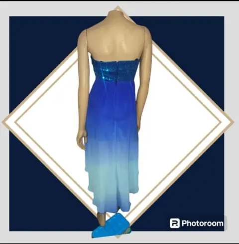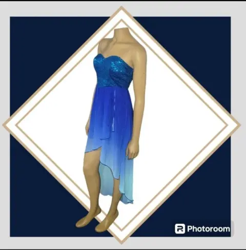 Vestido Formal Strapless Speechless. Vestido Formal Strapless Speechless, talla chica (3), azul marino, strapless, cola de pato, top de acento de chaquira, forrado de la falda con olanes transparente, cierre y ganchillo en la espalda, hecho de poliéster, con tira de silicona antideslizante al pecho, mide 34cm de axila a axila, 35cm de cintura con 64cm de largo al frente y 128cm de largo en la parte de atras de la axila hacia abajo