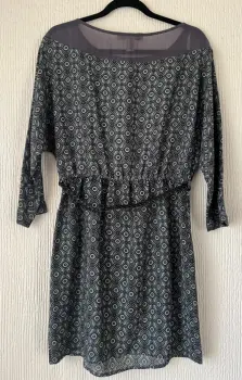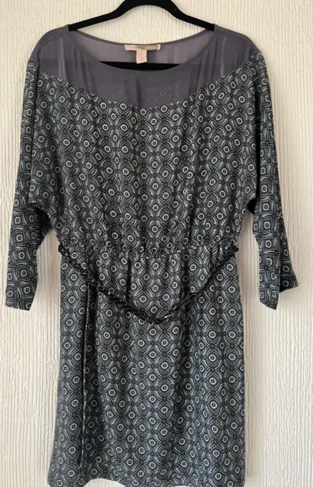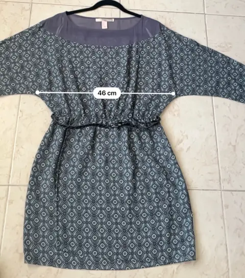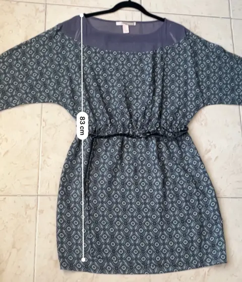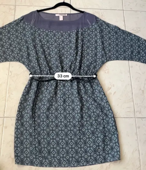 Vestido corto con cinturón. Color azul, verde y gris, mangas amplias, 100% polyester, marca Forever 21 talla M