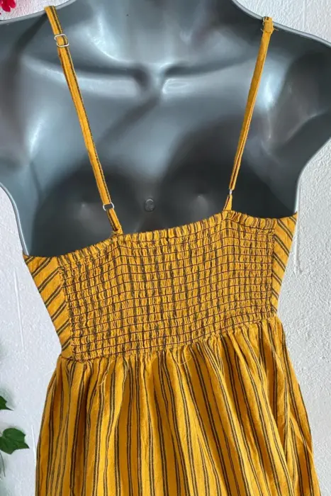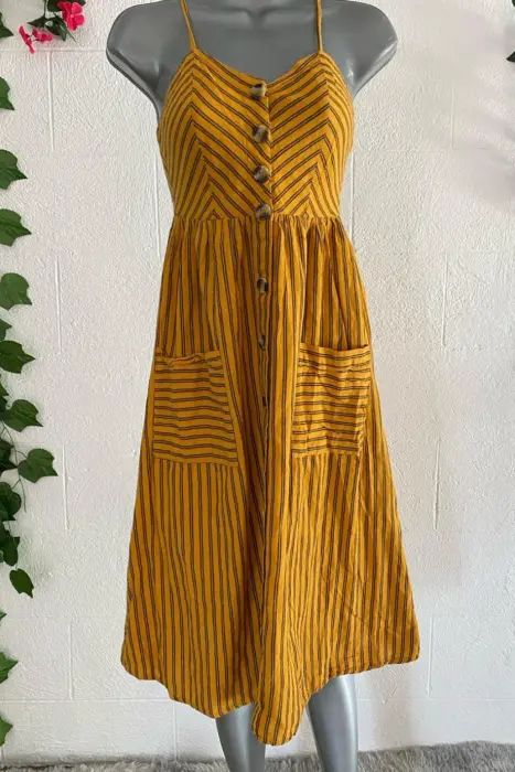Vestido fresco Ch. Bonito vestido holgado, con tirantes ajustables, botones y bolsitas. La tela es algodón. No tiene detalles de desgaste.