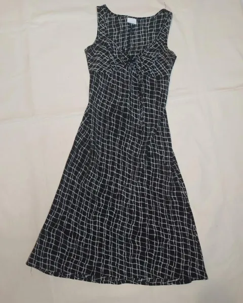Vestido fresco de tela formando cuadros. Fresco vestido, la tela forma cuadritos con la líneas hace bonita la figura, no estira, tiene escote en v y un listón para hacer moñito en rl frente, es de manga corta, no tiene forro, es muy fresco.