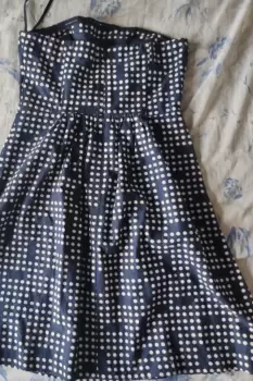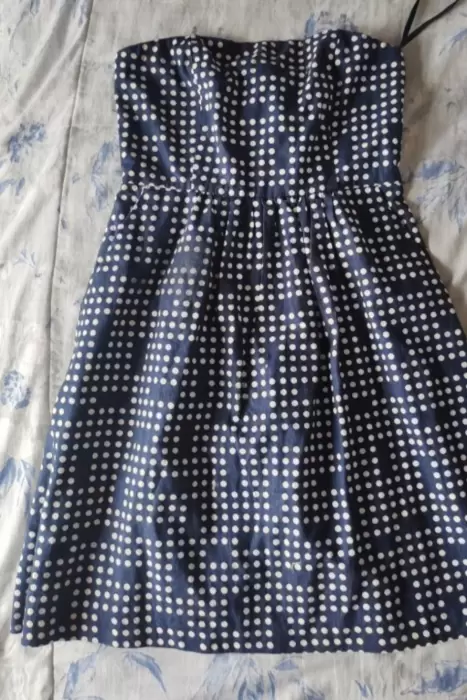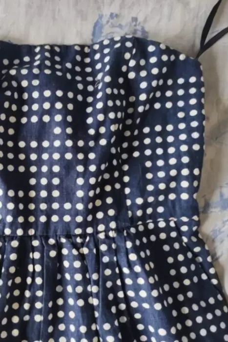 Lindo vestido con puntos / dots, tiene bolsillos a los costados, es estrapple, tiene una cinta que impide que se resbale, es tipo mezclilla delgada.largo 71busto 39cintura 34