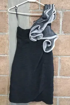 Vestido gasa. Vestido drapeado, adorno combinado en negro con marfil, solo una manga