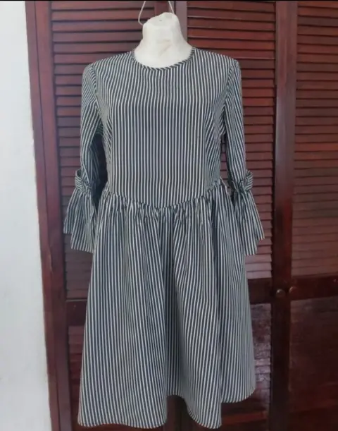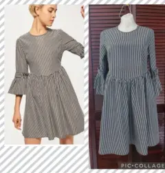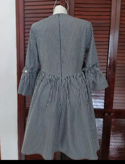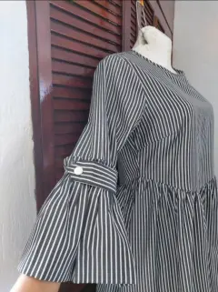 Vestido Girl a rayas. Me encanta! Luce bien bello. No tiene strech. Talla 38 americano que es como M. Rayas negro cenizo como gris con blanco.De axila a axila: 49 cmCintura: 43 cmLargo: 89 cmLargo de manga: 46 cm