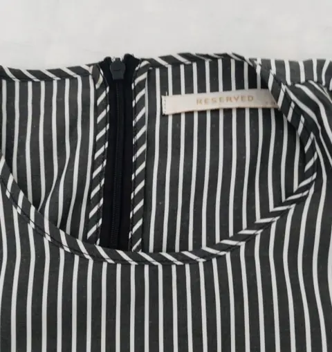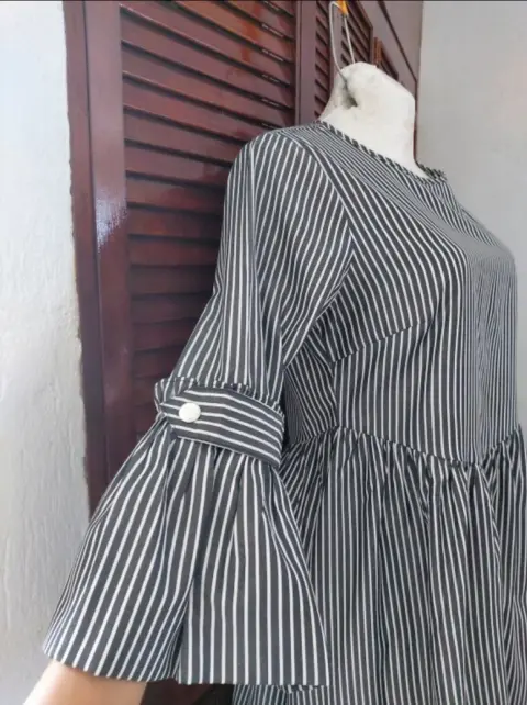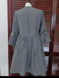 Me encanta! Luce bien bello. No tiene strech. Talla 38 americano que es como M. Rayas negro cenizo como gris con blanco.De axila a axila: 49 cmCintura: 43 cmLargo: 89 cmLargo de manga: 46 cm