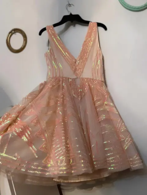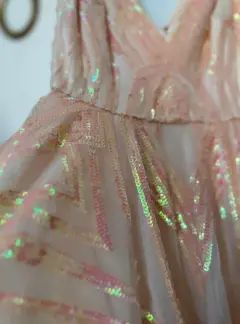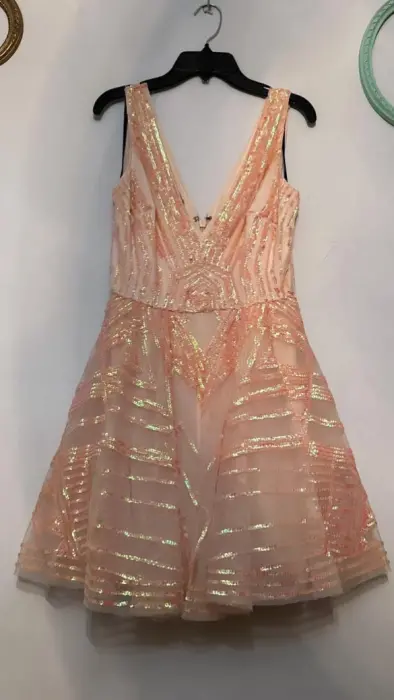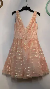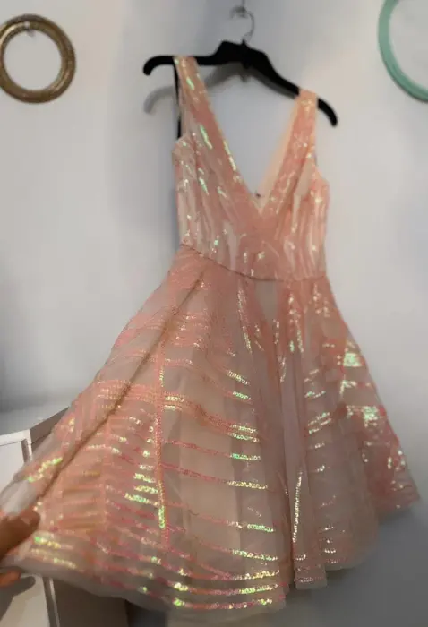 Hermoso vestido corto puesto una vez, con brillo sutil, esta como nuevo, no pica, tiene forro interior y cierre en la parte de atrás.