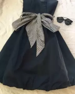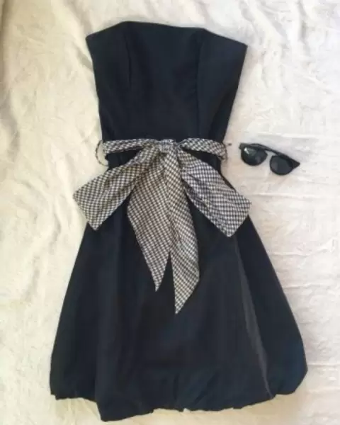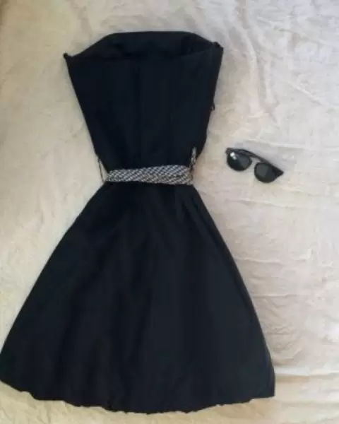 Pecho:41cm Cintura:35cm largo de la cintura a abajo: 65cmHermoso vestido negro con caída de globo. Súper coqueto, en la parte del torso trae pinzas para estilizar la cintura y al final de ella ajustar con la cinta que viene en color negro con blanco y tonos en plateado, para así tener una ligera caída en globo al final. Se ve súper lindo puesto.