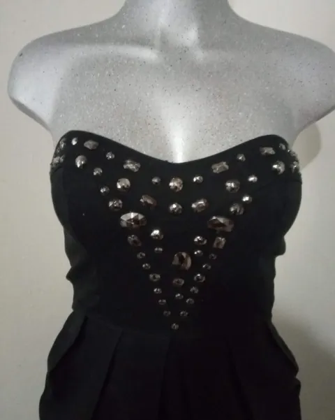 Vestido globo "Lob" negro escote corazón. Hermoso vestido "Lob" en color negro aglobado, escote en forma de corazón, con bellos adornos en color onix