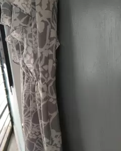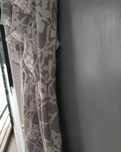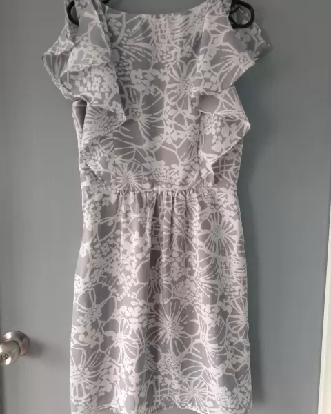 Vestido gris con flores blancas, llega a la rodilla (si mides alrededor de 1.65m). Tiene forro delgado que ayuda a que no se transparente. El cierre invisible lo tiene de lado izquierdo.