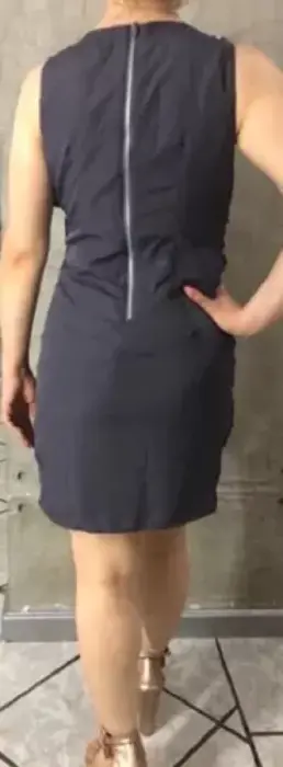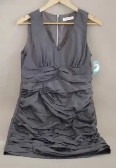 Vestido gris con pliegues, sin mangas, con cuello en V y tiene cierre en la espalda, es corto y fresco, es muy versátil.
