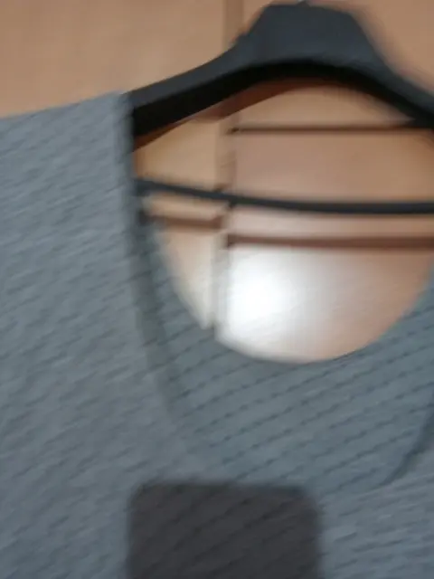 Vestido gris con puntos negros, cuello un U, espalda con escote U, manga tres cuartos , falda semicircular .