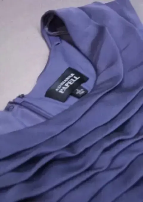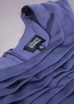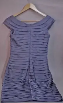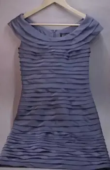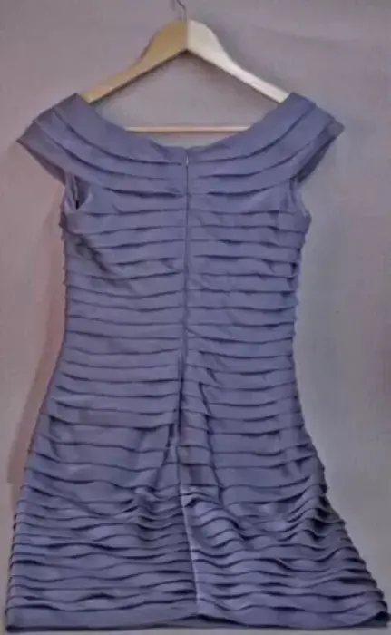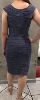 Vestido drapeado gris azul acero, corto, con cuello barco y cierre en la espalda, muy lindo y elegante.