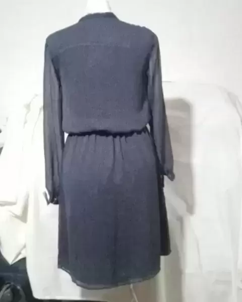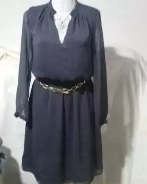 Vestido de tela gasa en color gris manga larga , cuello v . Largo hasta la rodilla poquito mas.