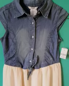 Vestido Guess sin mangas - kids. Lindo vestido de niña, simula 2 piezas, parte de arriba mezclilla deslavadad, botones de piedrita. Es talla 14 pero viene reducida del talle.
