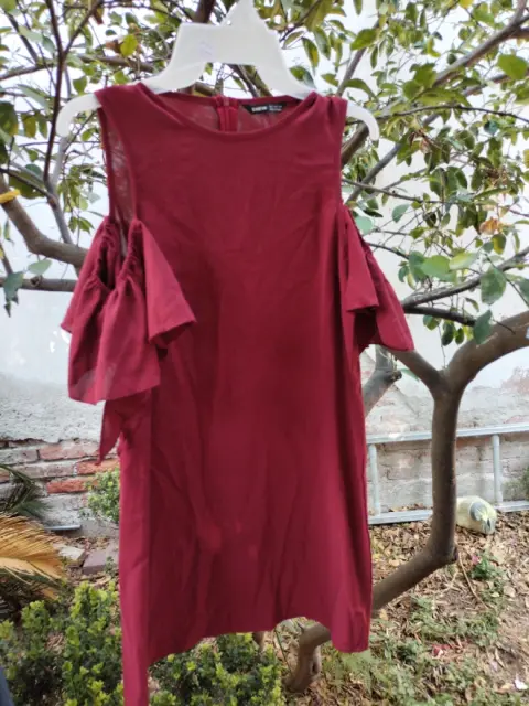 Vestido Guinda. Vestido color guinda con hombro descubierto y , manga holgada, corte hasta la rodilla