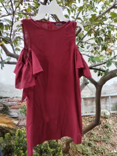 Vestido color guinda con hombro descubierto y , manga holgada, corte hasta la rodilla