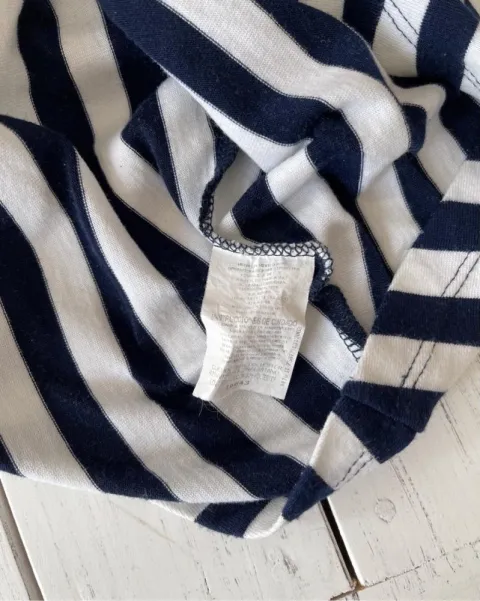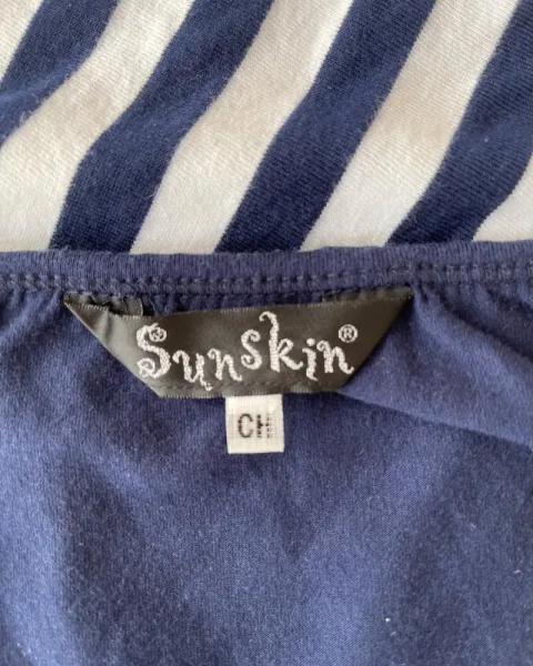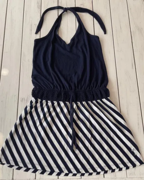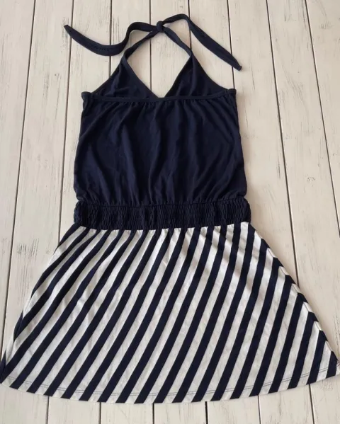 Vestido halter azul con rayas Sunskin. Talla: CH, se abrocha al cuello tipo halter y escote al frente V, medidas: 33 cm de axila (todavía da un par de cm más), 68 cm de largo.