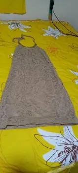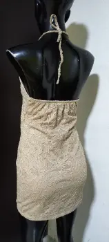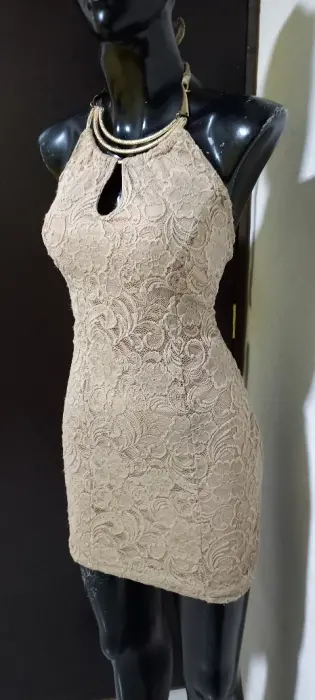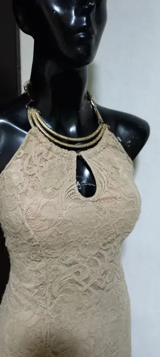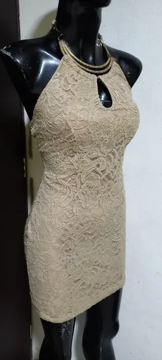 Vestido halter de encaje strech sexy y fresco. Gracias por tu visita ..En esta ocasión te traemos:..................................................................................TALLA chMARCA OzelCOLOR beigeSTRECH siTELA naylonMADE IN ?MEDIDAS HOMBRO AXILA 38 cm CINTURA 40 cm CADERA 47 cm LARGO 100 cm Desde el cuelloLas medidas son de lado a lado de la prenda