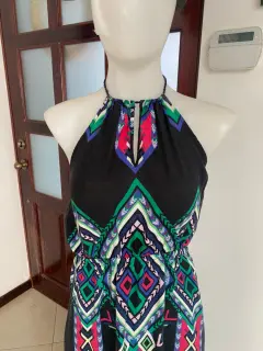 Vestido halter hippie. Tela de algodón fresca, con resorte en la cintura, las jaretas se amarran al cuello, tiene aberturas en los laterales de las piernas