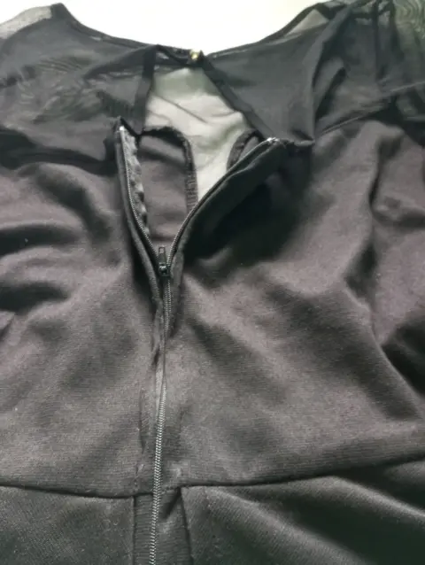 Vestido negro, talla chica, cierre atrás y estira un poquito. No le hace a una mediana