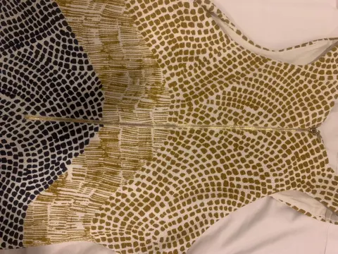 Vestido H&M multicolor amarillo, azul y beige, tipo halter con cierre en la espalda, tela strech talla M pero estira hasta una L, no se transparenta, fresco y cómodo!
