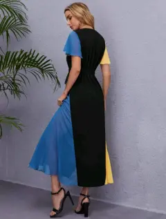El vestido es de una tela ligera y fresca, con algunos vuelos y detalles en color, incluye un cinto.Es talla L. No tiene ningún detalle ya que nunca ha sido usado.