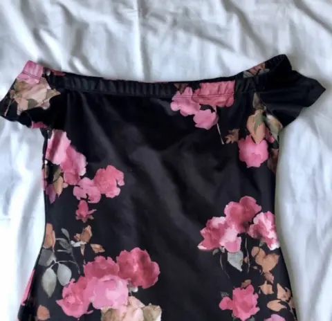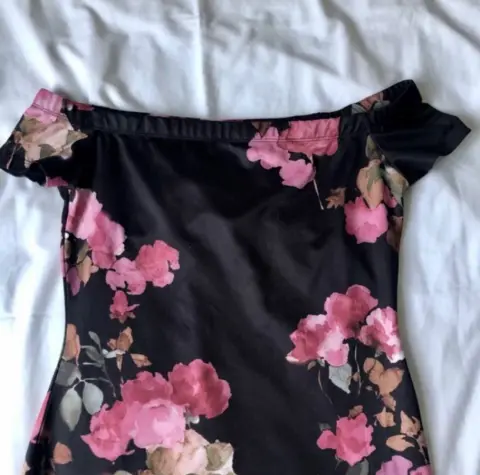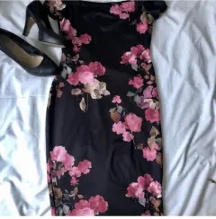 Vestido a hombros descubiertos, floreado negro, llega a la rodilla, a estrenar