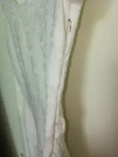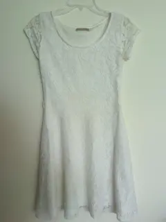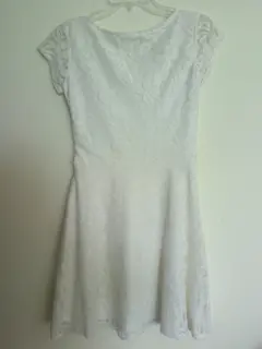 Vestido hueso /flores blancas. Vestido corto color hueso con flores blancas tipo encaje cuenta con cierre en el costado izquierdo y mangas pequeñas cubriendo el hombro