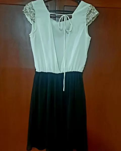 Vestido hueso y negro. Vestido ligero, color beige y negro, la tela es suave. En las mangas tiene detalles lentejuela color crema muy lindas, en la parte de atrás abierto en V. Suelto, ligeramente arriba de la rodilla. Excelente condiciones