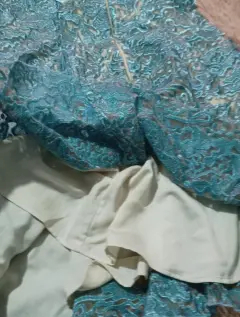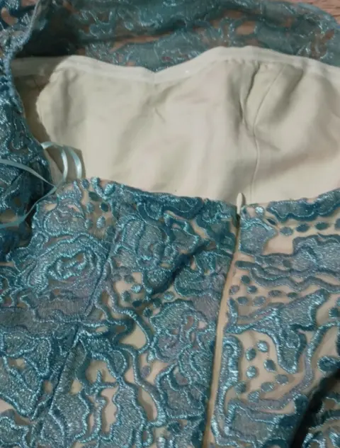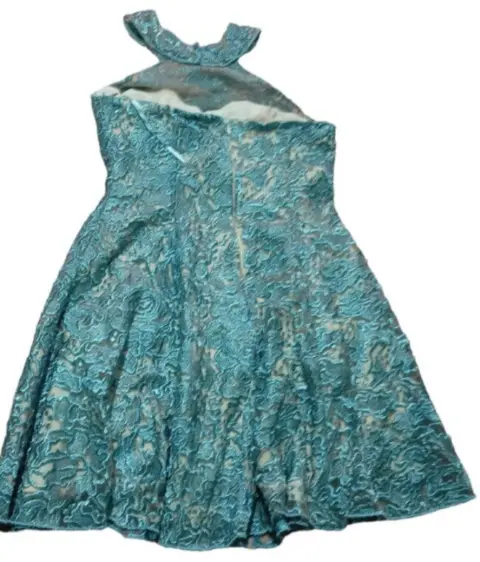 Elegante vestido de encaje transparente azul celeste con forro color beige, está en perfecto estado, es halter, tiene cierre en la espalda, talla 10