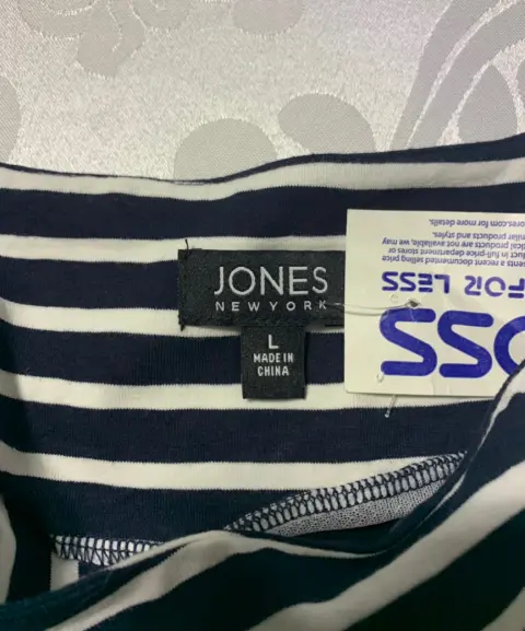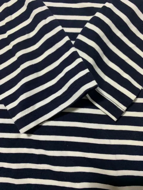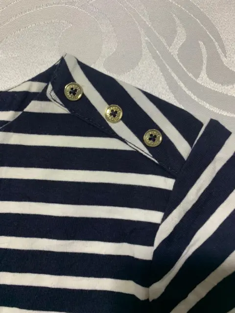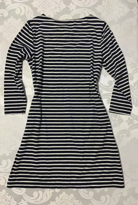Vestido Jones New York. Vestido con rayas horizontales, manga larga, cuello redondo, botones decorativos en un costado del hombro. Tela de algodón.Medidas/ busto: 52 cm, cintura: 53 cm, largo: 95 cm, largo de mangas: 55 cm
