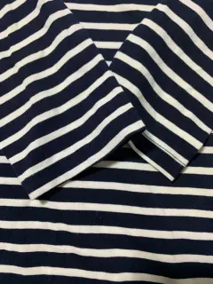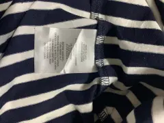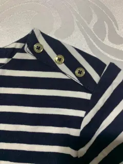 Vestido con rayas horizontales, manga larga, cuello redondo, botones decorativos en un costado del hombro. Tela de algodón.Medidas/ busto: 52 cm, cintura: 53 cm, largo: 95 cm, largo de mangas: 55 cm