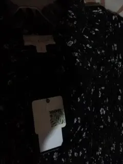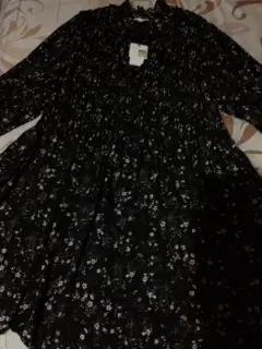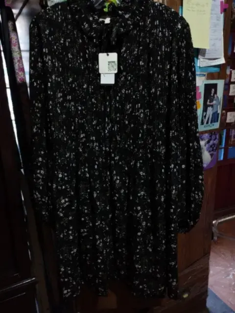 Talla grande, amplio, cómodo, estampado negro, con flores, cuello alto, manga larga, en la parte superior plisado , largo hasta la rodilla, nuevo completamente, con etiqueta.