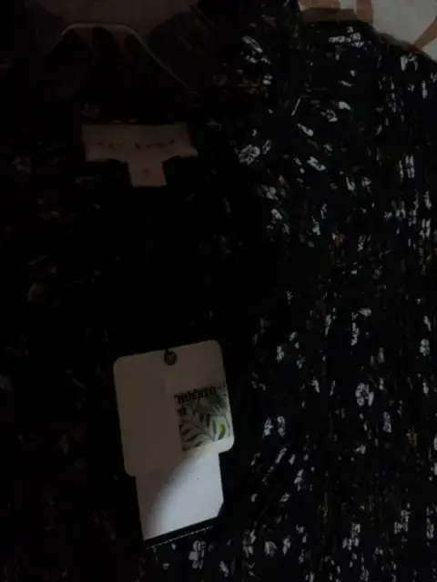Vestido kur.kuma. Talla grande, amplio, cómodo, estampado negro, con flores, cuello alto, manga larga, en la parte superior plisado , largo hasta la rodilla, nuevo completamente, con etiqueta.
