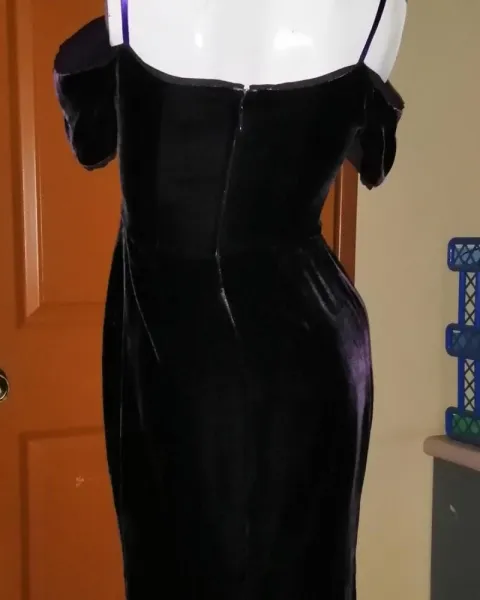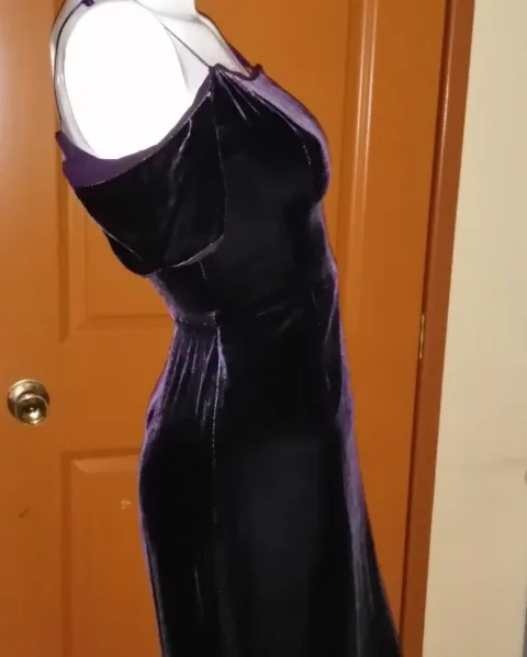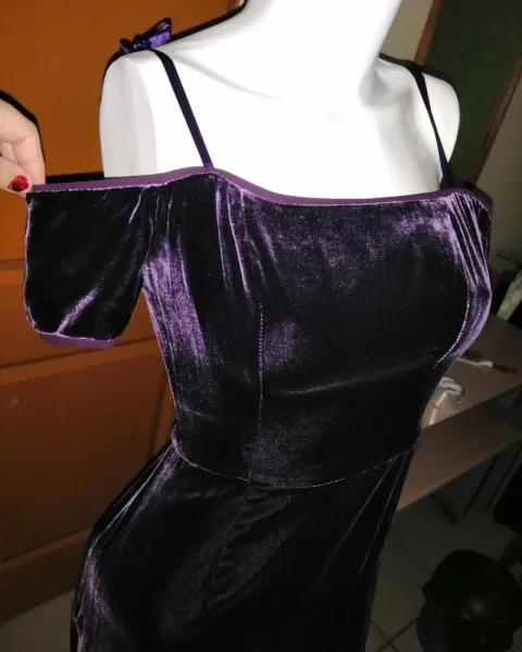 Vestido de Coctel 3/4, A los hombros color morado, Tela terciopelo, con apertura en la parte de atrás, y con cierre, Medidas: axila a axila : 44 cmsCintura total circunferencia : 64 cmsCadera Total : 96 cmsLargo medida tomada a la altura inicio del busto :90 cms