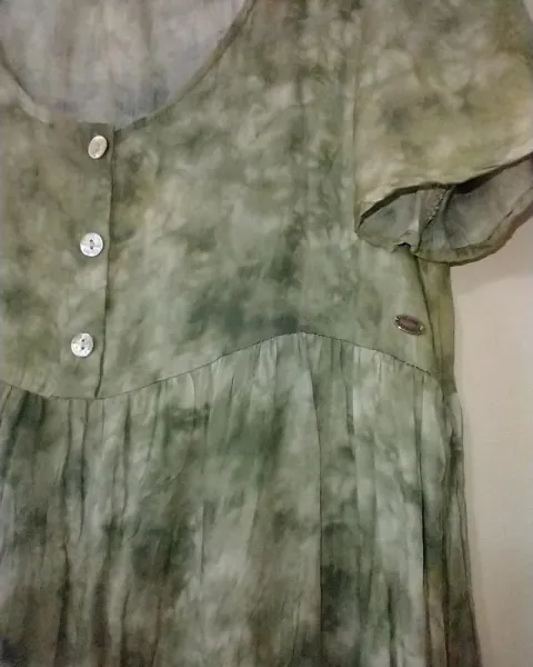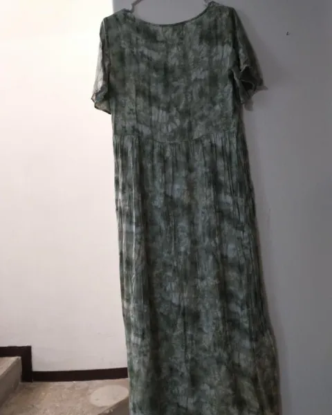 Vestido largo de manga corta con botones al frente. Color verde con blanco. Talla S. Usado una vez.