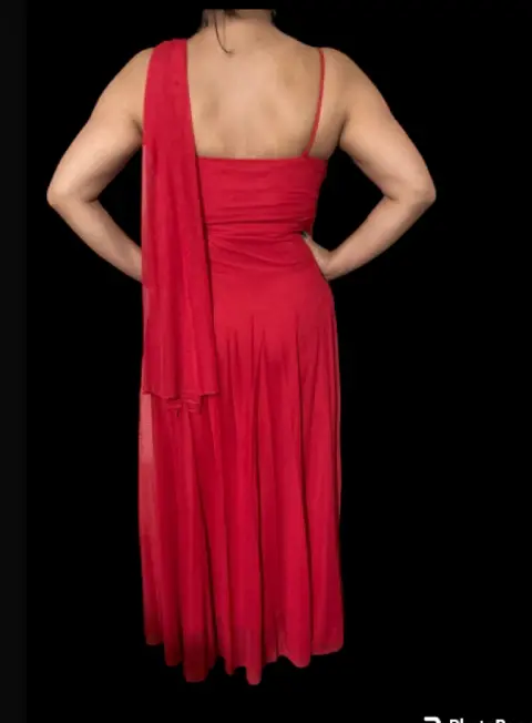 Vestido largo en color rojo Con detalles de pedrería en la parte de abajo del busto y de un lado del hombroMedidas 42 cms de cintura Largo 135 cms