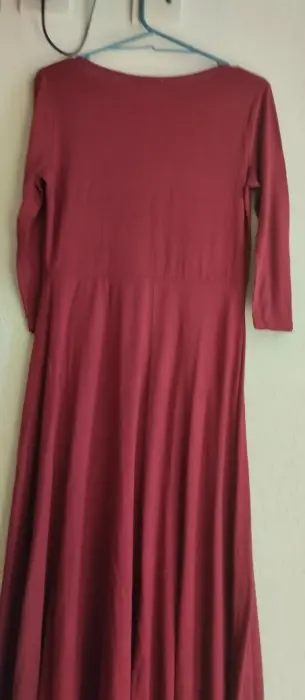 Vestido largo con manga larga, cuello redondo, y en linea A llega abajo de las pantorrillas, es ideal para una salida de compras, rojo color vino