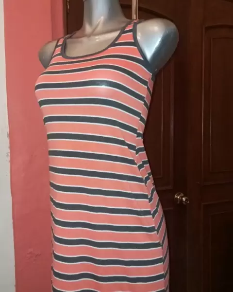 Vestido largo a rayas, multicolor, tirantes, y por detrás con resaque, axila 40cm, cintura 38cm, largo 123cm.