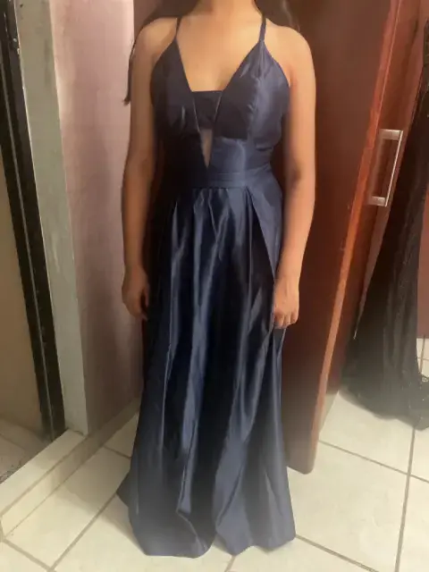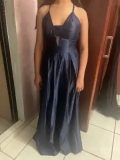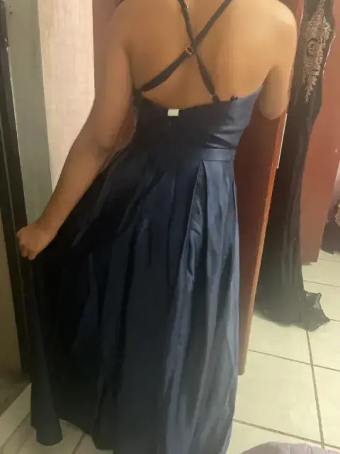 Vestido largo azul. Vestido largo con poco vuelo en color azul marino satinado escote de espalda cruzado y bonito escote al frente